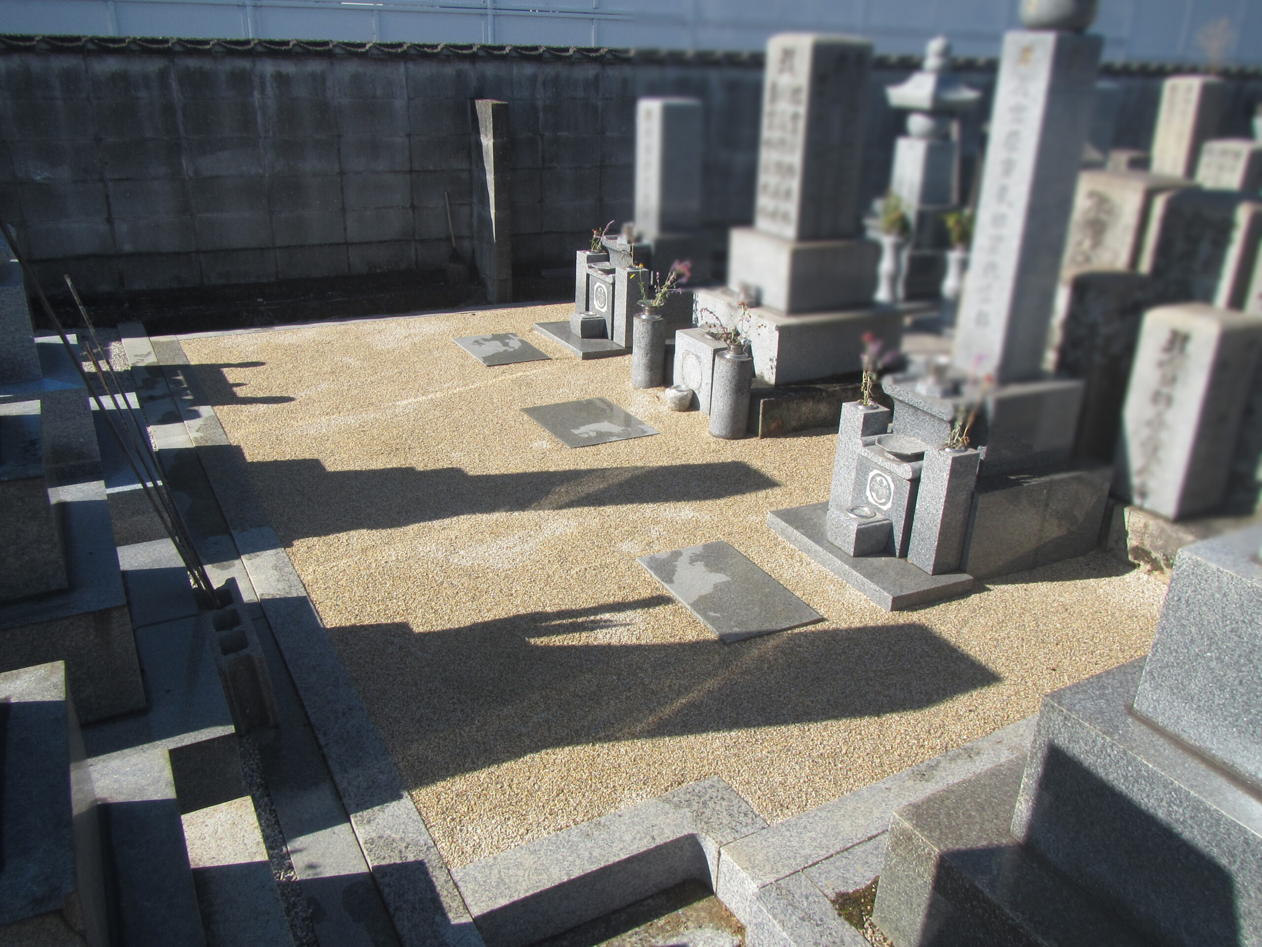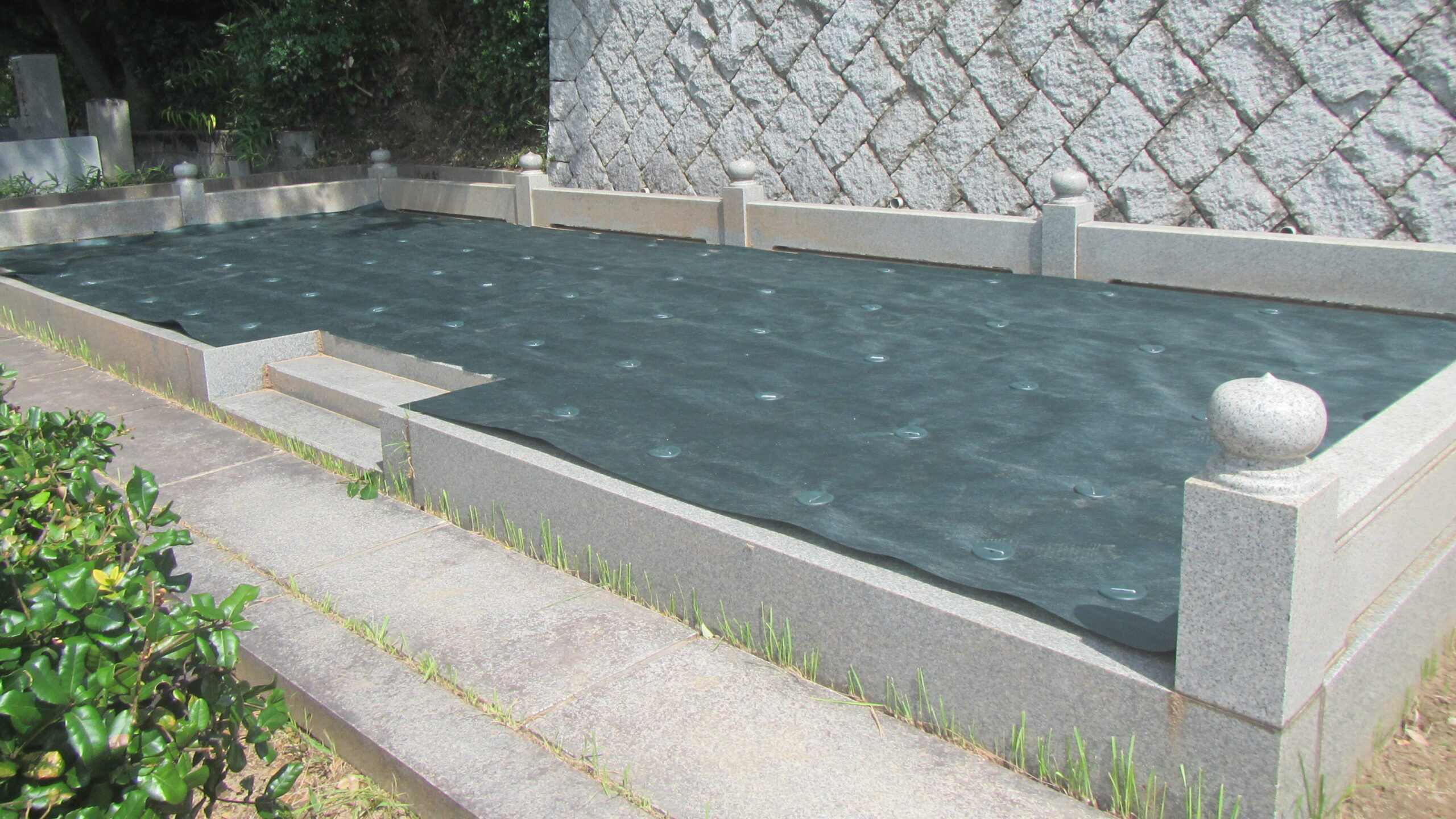 欠点:細かく入り組んだ場所への施工は、シートの接ぎ目が多くなり雑草の発生が抑えられない可能性あり。(例:4㎡、6㎡等の公営墓地区画、墓石と付属品の間隔が狭いため)